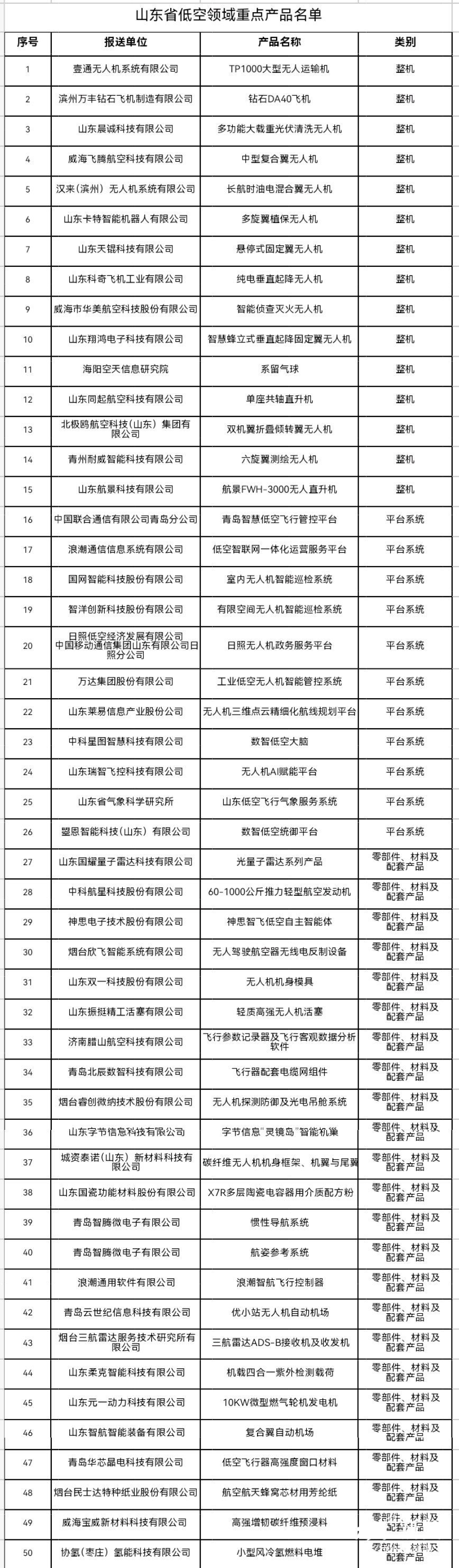 6月24日,山东省低空经济产业链创新发展会在滨州举行。前期,山东省工业和信息化厅、山东省交通运输厅面向全省征集了一批低空领域产品和应用场景,经企业自愿申报、有关部门推荐、专家评审、网上公示等程序,壹通无人机系统有限公司的TP1000大型无人运输机等50个低空领域重点产品、山东华威通用航空服务有限公司的尼山圣境短途空中游览等30个低空领域典型应用场景在会上公布。